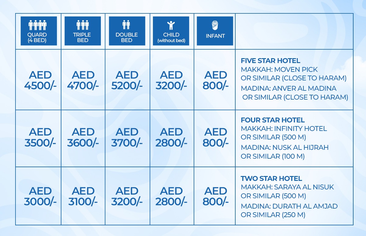 Embark on a spiritually enriching journey with our comprehensive Umrah package, which ensures a smooth and fulfilling pilgrimage experience. Our all-inclusive package provides a hassle-free Umrah visa, comfortable luxury bus transportation, premium accommodation, and covers all necessary border fees. You’ll also benefit from guided tours to significant religious sites (ziyarath), expert spiritual guidance, and educational Umrah classes to prepare and support you throughout your journey. Departures are scheduled every Wednesday from Sharjah, Dubai, and Abu Dhabi. To participate, please ensure you have a scanned, clear copy of your machine-readable passport and visa/Emirates ID, with your passport valid for at least 6 months and visa for 4 months upon entering Saudi Arabia, along with a passport-sized color photo with a white background. For more information and bookings, contact us at ,